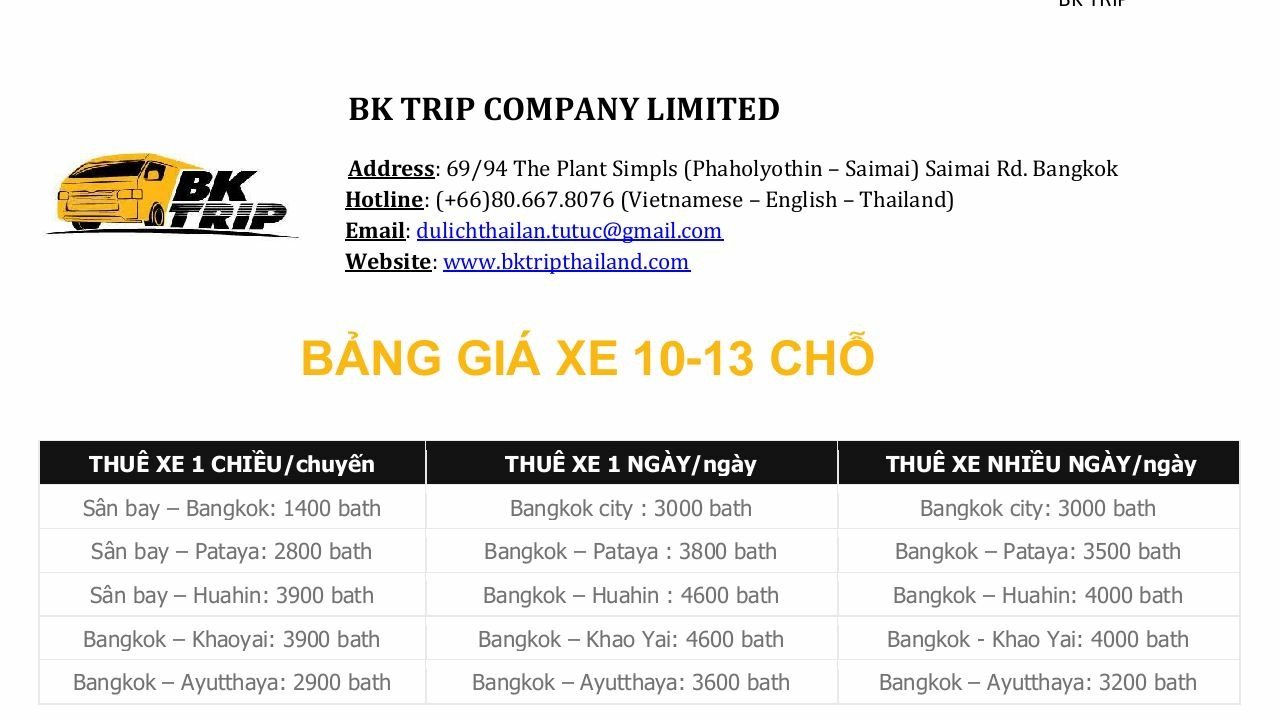 Để có 1 chuyến du lịch thái lan tự túc chất lượng các bạn có thể thuê xe ô tô có người lái tại BK TRIP. Tham quan rất an toàn và thoải mái lịch trình với giá thành rất phù hợp.