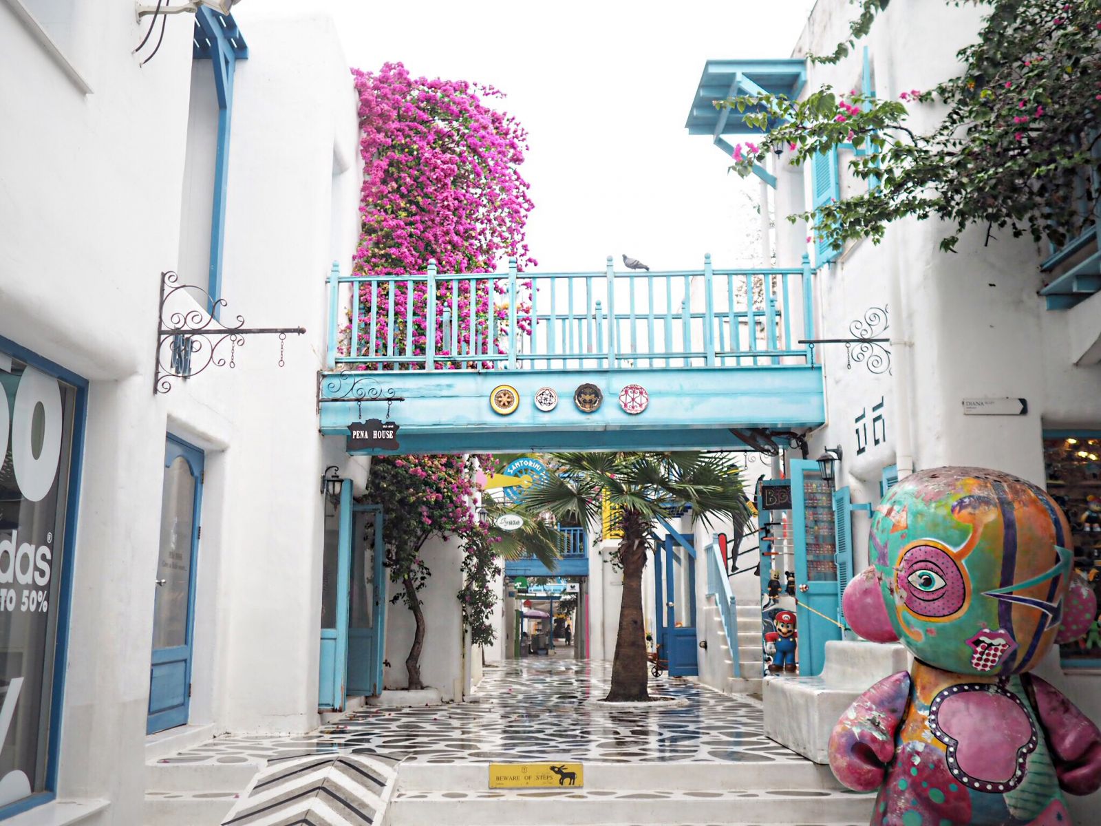 Ngoài những ngôi nhà có hoa giấy và cửa sổ màu trắng, Santorini Park còn giữ chân du khách nhờ những vật dụng trang trí xinh xắn như những chiếc cối xay gió, ghế xích đu, khu vườn cổ tích...